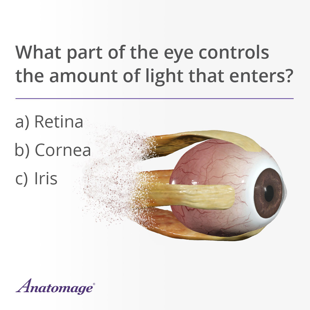 The iris, the colored part of your eye, controls how much light enters by adjusting the size of the pupil: It gets smaller in bright light and larger in the dark to help you see clearly.