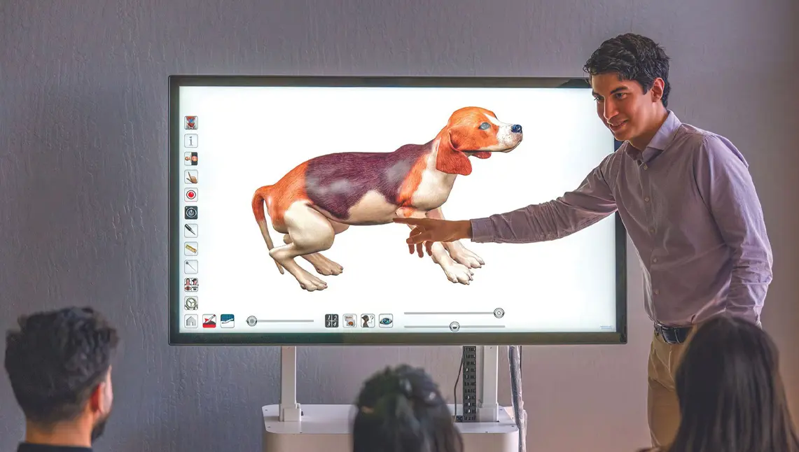 The Anatomage Table Vet can connect to projectors, displaying 3D visuals of animal anatomy and pathology. It also fosters classroom collaboration by enabling content sharing through screenshots.