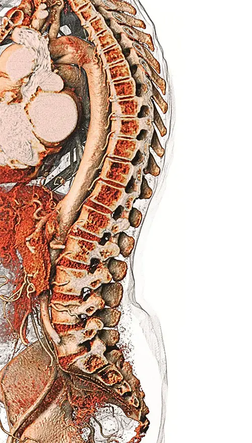 Detailed anatomical scan of the human spine and surrounding vascular structures, captured through advanced 3D imaging for human anatomy study and medical visualization.